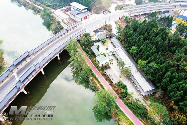 近日,記者驅車繞過市區旁的涪江大壩,沿芙蓉溪逆流而上,標有紅黃藍三色車道分隔線的車行道很別致,給寒冬增添了一道暖色。陽光的余暉下,位于游仙區游仙街道金山村內的一處棧道上,給正在拍照的年輕人身上也鍍上了一層金色,遠遠望去,仿佛童話般的世界。