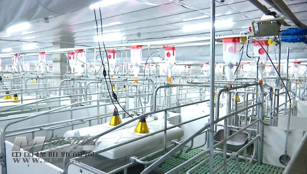 在鵝溪鎮劍河村新希望公司豬場的圈舍里,自動化喂料飲水系統、自動控溫系統、自動清糞系統、環控系統等配套設施一應俱全。