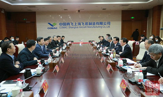 在中國商飛公司期間,曹立軍考察了企業5G創新中心、智能生產線、總裝生產線,詳細了解企業發展歷程、科技研發、智能制造等情況,并實地參觀了ARJ21、C919展示樣機。此次雙方還圍繞政企合作、產品研發、產品采購等方面簽訂合作協議和備忘錄。