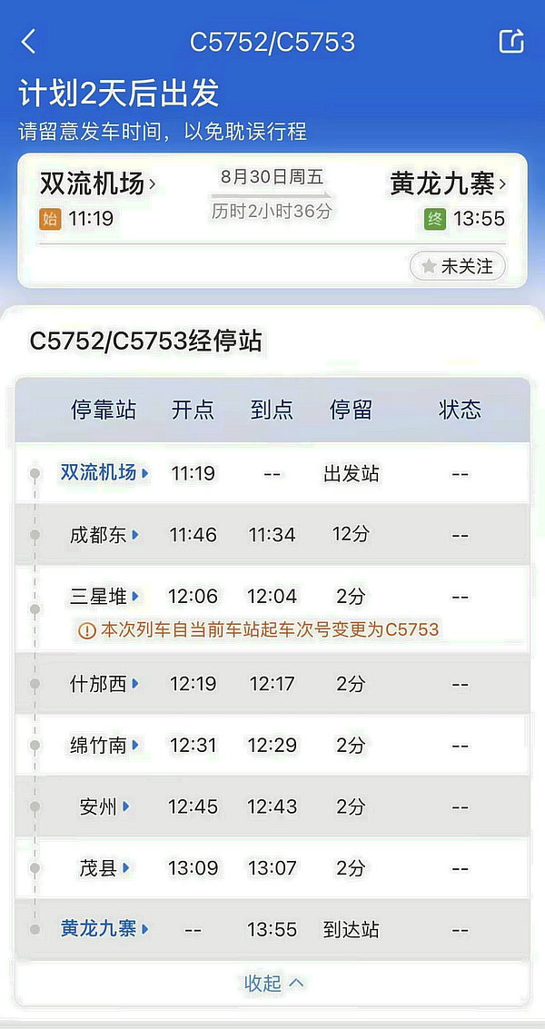 綿陽新聞網訊 8月28日,記者從12306網站時刻表看到,目前四川成都至青海西寧鐵路鎮江關至黃勝關段車次信息已可以查詢,最近的發車時間為8月30日,成都至黃龍九寨動車用時在兩小時左右,這也意味著成都到黃龍景區、九寨溝景區的車程將大大縮短。