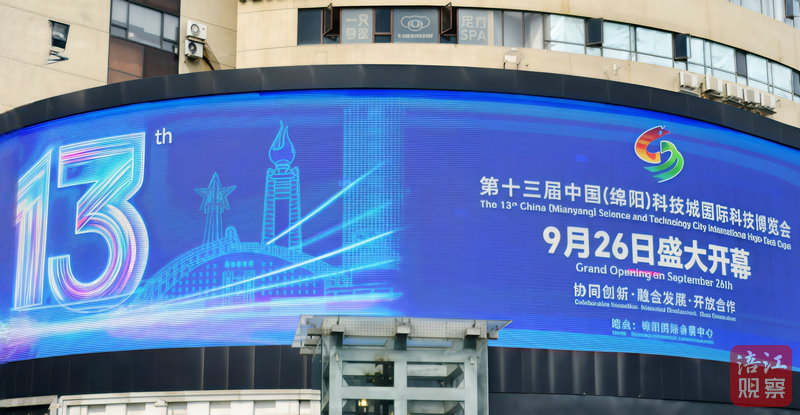 8月28日,記者在綿陽城區看到,臨園路百貨大樓南側的全彩LED顯示屏滾動播放第十三屆科博會主題海報。與此同時,數公里之外的城市奧萊一號門全彩LED顯示屏也呈現出科博會主題海報。在園藝山樂薈城,往來穿梭的市民與“科博藍”主題光影交相輝映,科技盛會的氛圍日漸濃厚。